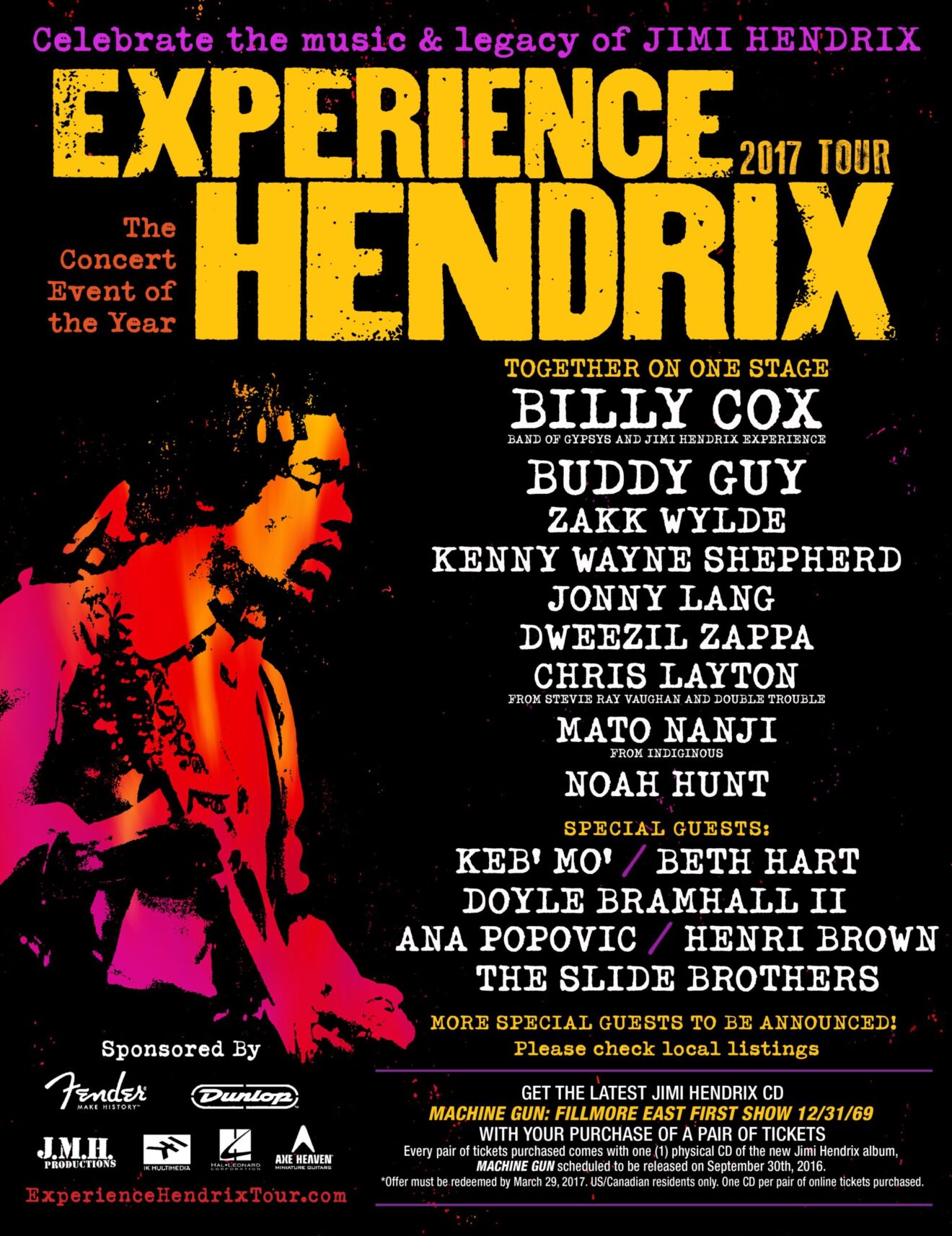 Experience Hendrix Tour is back for 2017! Every pair of tickets purchased from participating venues comes with the latest Jimi Hendrix CD Machine Gun: Fillmore East First Show 12/31/69. To witness this incredible musical experience first hand AND receive the CD of the new Jimi Hendrix album, Machine Gun get your TODAY!