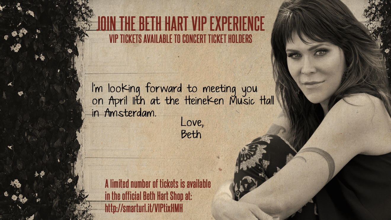 Do you have tickets to Beth Hart’s sold out show at the Heineken Music Hall in Amsterdam? Yes?! Then you are eligible to purchase one of the VIP tickets to this show. Make your day even more fun and special by joining the Beth Hart VIP experience!